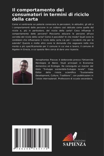 Come vi sentireste se poteste conoscere le percezioni, le abitudini, gli atti e i comportamenti delle persone in un settore così delicato come quello del riciclo e, più in particolare, del riciclo della carta? Cosa influenza il comportamento delle persone? Possiamo educare le persone all'uso corretto del riciclo della carta? Come è possibile? In che modo? Quali sono le condizioni che influenzano il riciclo della carta sia per i residenti che per le aziende? Queste e molte altre sono le domande che vagavano nella mia mente e più specificamente per il comune in cui vivo e lavoro, il comune di Aigaleo in Grecia, a cui questo libro cerca di dare una risposta.