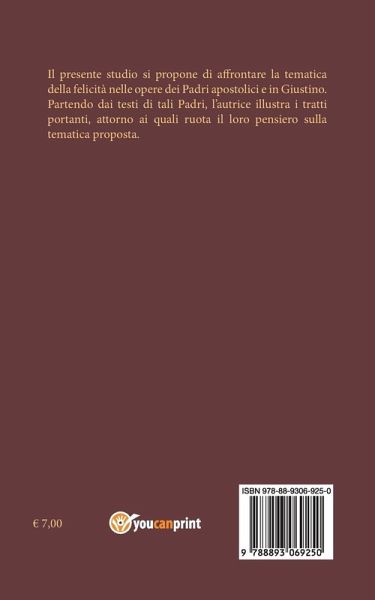 Il presente studio si propone di affrontare la tematica della felicità nelle opere dei Padri apostolici e in Giustino. Partendo da una lettura analitica dei testi di tali Padri, l'autrice illustra i tratti portanti, attorno ai quali ruota il loro pensiero sulla tematica proposta.