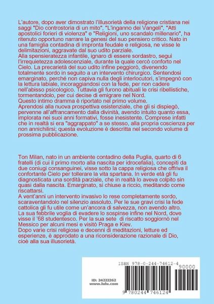 L'autore narra le vicende di un ragazzo sordastro che visse in una famiglia contadina di impronta feudale. Alla spensieratezza infantile seguì un'adolescenza inquieta, durante la quale ebbe fede in Dio, finché ventenne divenne sordo per un intervento chirurgico. Per risolvere la sua emarginazione si avvalse della lettura labiale, ma crisi ribellistiche lo tormentarono, infine decise di emigrare nel Nord. Ton Milan, figlio della Puglia contadina, quarto di 6 fratelli (di cui il primo morto alla nascita per idrocefalia), concepiti da due coniugi consanguinei, visse una vita spartana. Affetto da sordità parziale, che aveva sin dalla nascita, divenne poi sordo per un intervento chirurgico. Crisi intime lo tormentarono, ma senza mai interrompere gli studi. Infine emigrò nel Nord, vivendo il '68 studentesco e avendo occasione di recarsi all'estero, soggiornando in Messico e visitando Praga e Kiev. Per le sue crisi religiose comprese che Dio era in realtà la sua coscienza.