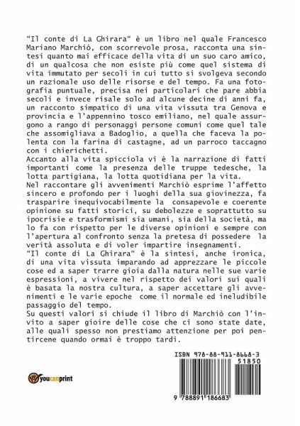 "Il conte di La Ghirara" è un libro nel quale Francesco Mariano Marchiò, con scorrevole prosa, racconta una sintesi quanto mai efficace della vita di un suo caro amico, di un qualcosa che non esiste più come quel sistema di vita immutato per secoli in cui tutto si svolgeva secondo un razionale uso delle risorse e del tempo. Fa una fotografia puntuale, precisa nei particolari che pare abbia secoli e invece risale solo ad alcune decine di anni fa, un racconto simpatico di una vita vissuta tra Genova e provincia e l'appennino tosco emiliano, nel quale assurgono a rango di personaggi persone comuni come quel tale che assomigliava a Badoglio, a quella che faceva la polenta con la farina di castagne, ad un parroco taccagno con i chierichetti. Accanto alla vita spicciola vi è la narrazione di fatti importanti come la presenza delle truppe tedesche, la lotta partigiana, la lotta quotidiana per la vita. Nel raccontare gli avvenimenti Marchiò esprime l'affetto sincero e profondo per i luoghi della sua giovinezza, fa trasparire inequivocabilmente la consapevole e coerente opinione su fatti storici, su debolezze e soprattutto su ipocrisie e trasformismi sia umani, sia della società, ma lo fa con rispetto per le diverse opinioni e sempre con l'apertura al confronto senza la pretesa di possedere la verità assoluta e di voler impartire insegnamenti. "Il conte di La Ghirara" è la sintesi, anche ironica, di una vita vissuta imparando ad apprezzare le piccole cose ed a saper trarre gioia dalla natura nelle sue varie espressioni, a vivere nel rispetto dei valori sui quali è basata la nostra cultura, a saper accettare gli avvenimenti e le varie epoche come il normale ed ineludibile passaggio del tempo. Su questi valori si chiude il libro di Marchiò con l'invito a saper gioire delle cose che ci sono state date, alle quali spesso non prestiamo attenzione per poi pentircene quando ormai è troppo tardi.