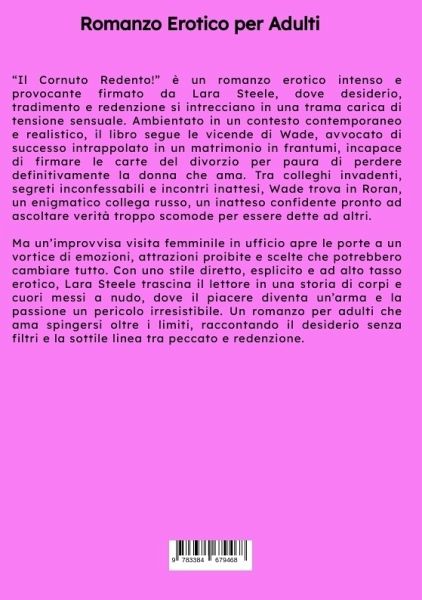 "Il Cornuto Redento!" è un romanzo erotico intenso e provocante firmato da Lara Steele, dove desiderio, tradimento e redenzione si intrecciano in una trama carica di tensione sensuale. Ambientato in un contesto contemporaneo e realistico, il libro segue le vicende di Wade, avvocato di successo intrappolato in un matrimonio in frantumi, incapace di firmare le carte del divorzio per paura di perdere definitivamente la donna che ama. Tra colleghi invadenti, segreti inconfessabili e incontri inattesi, Wade trova in Roran, un enigmatico collega russo, un inatteso confidente pronto ad ascoltare verità troppo scomode per essere dette ad altri. Ma un'improvvisa visita femminile in ufficio apre le porte a un vortice di emozioni, attrazioni proibite e scelte che potrebbero cambiare tutto. Con uno stile diretto, esplicito e ad alto tasso erotico, Lara Steele trascina il lettore in una storia di corpi e cuori messi a nudo, dove il piacere diventa un'arma e la passione un pericolo irresistibile. Un romanzo per adulti che ama spingersi oltre i limiti, raccontando il desiderio senza filtri e la sottile linea tra peccato e redenzione.