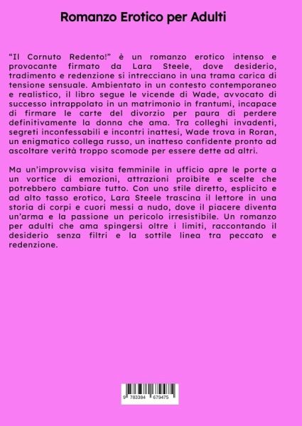 "Il Cornuto Redento!" è un romanzo erotico intenso e provocante firmato da Lara Steele, dove desiderio, tradimento e redenzione si intrecciano in una trama carica di tensione sensuale. Ambientato in un contesto contemporaneo e realistico, il libro segue le vicende di Wade, avvocato di successo intrappolato in un matrimonio in frantumi, incapace di firmare le carte del divorzio per paura di perdere definitivamente la donna che ama. Tra colleghi invadenti, segreti inconfessabili e incontri inattesi, Wade trova in Roran, un enigmatico collega russo, un inatteso confidente pronto ad ascoltare verità troppo scomode per essere dette ad altri. Ma un'improvvisa visita femminile in ufficio apre le porte a un vortice di emozioni, attrazioni proibite e scelte che potrebbero cambiare tutto. Con uno stile diretto, esplicito e ad alto tasso erotico, Lara Steele trascina il lettore in una storia di corpi e cuori messi a nudo, dove il piacere diventa un'arma e la passione un pericolo irresistibile. Un romanzo per adulti che ama spingersi oltre i limiti, raccontando il desiderio senza filtri e la sottile linea tra peccato e redenzione.