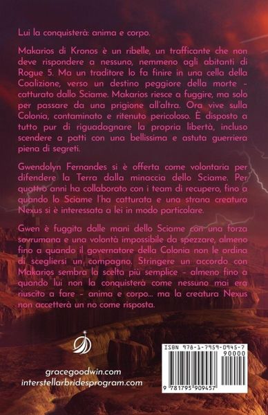 Lui la conquisterà: anima e corpo. Makarios di Kronos è un ribelle, un trafficante che non deve rispondere a nessuno, nemmeno agli abitanti di Rogue 5. Ma un traditore lo fa finire in una cella della Coalizione, verso un destino peggiore della morte - catturato dallo Sciame. Makarios riesce a fuggire, ma solo per passare da una prigione all'altra. Ora vive sulla Colonia, contaminato e ritenuto pericoloso. È disposto a tutto pur di riguadagnare la propria libertà, incluso scendere a patti con una bellissima e astuta guerriera piena di segreti. Gwendolyn Fernandes si è offerta come volontaria per difendere la Terra dalla minaccia dello Sciame. Per quattro anni ha collaborato con i team di recupero, fino a quando lo Sciame l'ha catturata e una strana creatura Nexus si è interessata a lei in modo particolare. Gwen è fuggita dalle mani dello Sciame con una forza sovrumana e una volontà impossibile da spezzare, almeno fino a quando il governatore della Colonia non le ordina di scegliersi un compagno. Stringere un accordo con Makarios sembra la scelta più semplice - almeno fino a quando lui non la conquisterà come nessuno mai era riuscito a fare - anima e corpo... ma la creatura Nexus non accetterà un no come risposta.