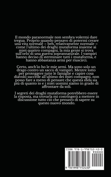 Il mondo paranormale non sembra volermi dare tregua. Proprio quando pensavo di potermi creare una vita normale - beh, relativamente normale - come l'ultimo dei draghi mutaforma insieme ai miei quattro compagni, la mia gente si trova sull'orlo di una guerra soprannaturale. I vampiri hanno deciso di sterminare tutti i mutaforma, e hanno abbastanza armi per riuscirci. Certo, anch'io ho le mie armi. Ma sono solo un drago contro un sacco di vampiri. Mentre lotto per proteggere tutte le famiglie e capire cosa diavolo succede all'ultimo dei miei compagni, non posso fare a meno di pensare che questa sfida sia più di quanto io e i miei uomini siamo in grado di affrontare da soli. I segreti dei draghi mutaforma potrebbero essere la risposta, ma trovarla mi costringerà a mettere in discussione tutto ciò che pensavo di sapere su questo nuovo mondo.