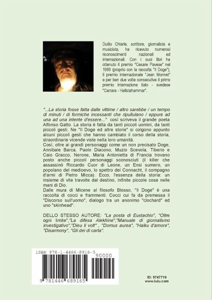 "...La storia fosse fatta dalle vittime/altro sarebbe/ un tempo di minuti/ di formiche incessanti che ripullulano/ eppure ad una ad una intente d'essere..." così scriveva il grande poeta Alfonso Gatto. La storia è fatta da tanti piccoli uomini da tanti piccoli gesti. Ne "il Doge ed altre storie" si colgono appunto alcuni piccoli gesti che hanno cambiato il corso della storia, straordinarie vicende viste nella loro umanità. Così, oltre ai grandi personaggi come un non precisato Doge, Annibale Barca, Paolo Diacono, Muzio Scevola, Tiberio e Caio Gracco, Nerone, Maria Antonietta trovano posto anche piccoli personaggi sconosciuti (il killer che assassinò Riccardo Lionheart, un Ensi Sumero, un popolano del medioevo, lo spettro del Connacht, il compagno d'armi di Pietro Micca). Ecco, l'essenza della storia: un insieme di vite travolte dal destino, infinite piccole cose nelle mani di Dio.