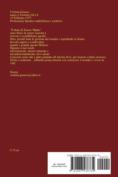 "il dono di Essere Madre" la fantastica storia dallo stupore del concepimento alla grandezza e al mistero di una nuova vita. Racconto, la meravigliosa avventura del seme piantato all'interno del grembo di ogni donna che ha la capacità di nascere, crescere, vivere e maturare così profondamente da diventare una nuova creatura da educare e ascoltare. Se ti osservi dentro, ti ascolti e ti ami, ti accorgerai che la creatura che è all'interno di te già ti ama e ti adora per tutto quello che incosapevolmente le stai donando. Percepisce tutto e ti amerà profondamente come solo un figlio può amare la propria madre e tu lo amerai come solo una madre può amare il proprio figlio. Pace e Bene all'interno di te stessa.