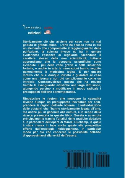 L'individuazione delle costanti che hanno storicamente legato la casualità all'arte è lo scopo della ricerca presentata in questo libro. Questa è avvenuta principalmente tramite l'analisi delle pratiche Dadaiste e in particolare dell'opera di Marcel Duchamp, la quale è stata messa in luce anche grazie alle prospettive offerte dall'ontologia heideggeriana, in particolar modo per ciò che concerne le possibilità dell'arte d'approssimarsi alla verità dell'essere.