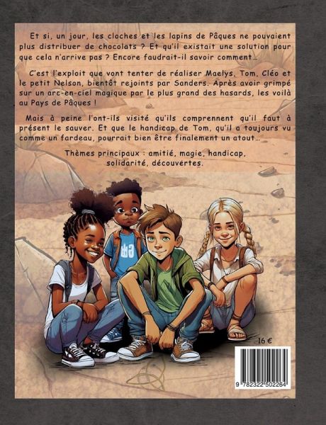 Et si, un jour, les cloches et les lapins de Pâques ne pouvaient plus distribuer de chocolats ? Et qu'il existait une solution pour que cela n'arrive pas ? Encore faudrait-il savoir comment...C'est l'exploit que vont tenter de réaliser Maelys, Tom, Cléo et le petit Nelson, bientôt rejoints par Sanders. Après avoir grimpé sur un arc-en-ciel magique par le plus grand des hasards, les voilà au Pays de Pâques ! Mais à peine l'ont-ils visité qu'ils comprennent qu'il faut à présent le sauver. Et que le handicap de Tom, qu'il a toujours vu comme un fardeau, pourrait bien être finalement un atout... Thèmes principaux : amitié, magie, handicap, solidarité, découverte du monde.