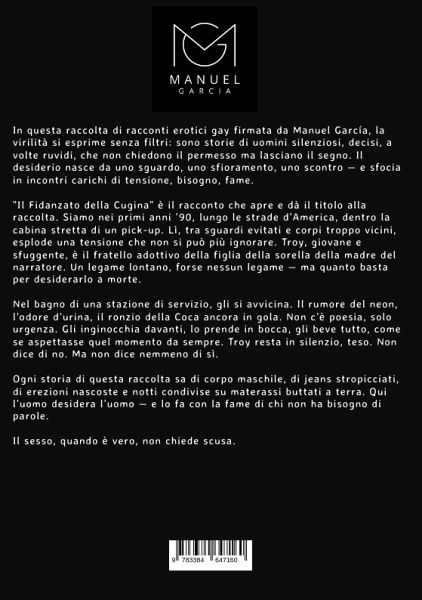 In questa raccolta di racconti erotici gay firmata da Manuel García, la virilità si esprime senza filtri: sono storie di uomini silenziosi, decisi, a volte ruvidi, che non chiedono il permesso ma lasciano il segno. Il desiderio nasce da uno sguardo, uno sfioramento, uno scontro - e sfocia in incontri carichi di tensione, bisogno, fame."Il Fidanzato della Cugina" è il racconto che apre e dà il titolo alla raccolta. Siamo nei primi anni '90, lungo le strade d'America, dentro la cabina stretta di un pick-up. Lì, tra sguardi evitati e corpi troppo vicini, esplode una tensione che non si può più ignorare. Troy, giovane e sfuggente, è il fratello adottivo della figlia della sorella della madre del narratore. Un legame lontano, forse nessun legame - ma quanto basta per desiderarlo a morte.Nel bagno di una stazione di servizio, gli si avvicina. Il rumore del neon, l'odore d'urina, il ronzio della Coca ancora in gola. Non c'è poesia, solo urgenza. Gli inginocchia davanti, lo prende in bocca, gli beve tutto, come se aspettasse quel momento da sempre. Troy resta in silenzio, teso. Non dice di no. Ma non dice nemmeno di sì.Ogni storia di questa raccolta sa di corpo maschile, di jeans stropicciati, di erezioni nascoste e notti condivise su materassi buttati a terra. Qui l'uomo desidera l'uomo - e lo fa con la fame di chi non ha bisogno di parole.Il sesso, quando è vero, non chiede scusa.