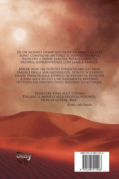 Il Figlio del Temporale Libro primo della Trilogia delle Ombre Nuova Edizione completa di mappa e illustrazioni Di un mondo desertico dove la fame e la sete sono compagne abituali, il popolo Nahin è riuscito a farne dimora intagliando la propria sopravvivenza con lame e sangue. Màlek non ha potuto dimenticare gli anni tragici della sua giovinezza. Spinto soltanto da un primordiale istinto di vendetta riuscirà a fare luce su ciò che realmente avvenne, tuttavia un insospettato destino lo attende. "Resistere fino allo stremo. Piegare il mondo alla propria volontà. Non desistere. Mai!" Il codice della Guardia Una trilogia dark fantasy La Trilogia delle Ombre è un'opera dark fantasy: combina la fantasia con elementi dell'orrore e la narrazione ha un tono cupo, oscuro. Non c'è lotta fra bene e male, ma la morale assume varie sfumature di grigio, rivelando l'intima natura dell'animo umano. I romanzi che la compongono sono: 1. Il Figlio del Temporale 2. Il Guerriero senza Passato 3. I Guardiani d'Ombra Trama La storia inizia nel Deserto di Fuoco, un posto inospitale, popolato da creature feroci. Lì in un accampamento di nomadi, i Nahin, nascerà Màlek, il Figlio del Temporale. La gente del posto l'ha soprannominato così perché ha avuto la sfortuna di venire al mondo durante un temporale, il primo vero dopo anni di siccità, e il funesto retaggio datogli da quel nome lo marchierà per sempre. Segnerà la sua infanzia, vivrà lutti e perdite, tragici eventi che alimenteranno in lui il bisogno di proteggere le ultime persone rimastegli al mondo, ma soprattutto il suo desiderio di vendetta. Màlek lo perseguirà sino all'età adulta, mettendo a repentaglio la sua vita stessa, finché non si troverà suo malgrado invischiato in qualcosa ben più grande di se stesso. Perseguitato dal passato e da oscure creature, Màlek sarà costretto a mettersi in viaggio al fianco di un misterioso guerriero, per poi scoprire di condividere lo stesso destino con quell'uomo tanto diverso da lui. Il motivo però gli resterà oscuro, tanto quanto le origini della sfortuna che lo perseguita.