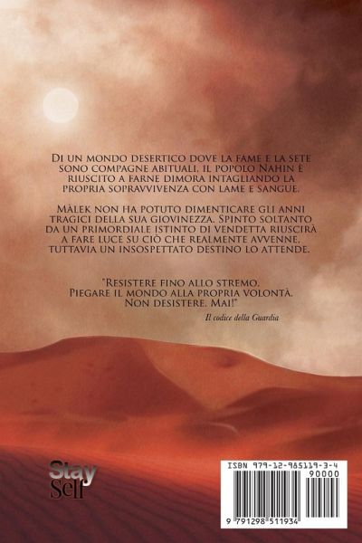 Il Figlio del Temporale Libro primo della Trilogia delle Ombre Nuova Edizione completa di mappa e illustrazioni Di un mondo desertico dove la fame e la sete sono compagne abituali, il popolo Nahin è riuscito a farne dimora intagliando la propria sopravvivenza con lame e sangue. Màlek non ha potuto dimenticare gli anni tragici della sua giovinezza. Spinto soltanto da un primordiale istinto di vendetta riuscirà a fare luce su ciò che realmente avvenne, tuttavia un insospettato destino lo attende. "Resistere fino allo stremo. Piegare il mondo alla propria volontà. Non desistere. Mai!" Il codice della Guardia Una trilogia dark fantasy La Trilogia delle Ombre è un'opera dark fantasy: combina la fantasia con elementi dell'orrore e la narrazione ha un tono cupo, oscuro. Non c'è lotta fra bene e male, ma la morale assume varie sfumature di grigio, rivelando l'intima natura dell'animo umano. I romanzi che la compongono sono: 1. Il Figlio del Temporale 2. Il Guerriero senza Passato 3. I Guardiani d'Ombra Trama La storia inizia nel Deserto di Fuoco, un posto inospitale, popolato da creature feroci. Lì in un accampamento di nomadi, i Nahin, nascerà Màlek, il Figlio del Temporale. La gente del posto l'ha soprannominato così perché ha avuto la sfortuna di venire al mondo durante un temporale, il primo vero dopo anni di siccità, e il funesto retaggio datogli da quel nome lo marchierà per sempre. Segnerà la sua infanzia, vivrà lutti e perdite, tragici eventi che alimenteranno in lui il bisogno di proteggere le ultime persone rimastegli al mondo, ma soprattutto il suo desiderio di vendetta. Màlek lo perseguirà sino all'età adulta, mettendo a repentaglio la sua vita stessa, finché non si troverà suo malgrado invischiato in qualcosa ben più grande di se stesso. Perseguitato dal passato e da oscure creature, Màlek sarà costretto a mettersi in viaggio al fianco di un misterioso guerriero, per poi scoprire di condividere lo stesso destino con quell'uomo tanto diverso da lui. Il motivo però gli resterà oscuro, tanto quanto le origini della sfortuna che lo perseguita.