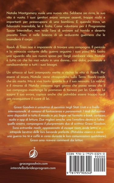 Natalie Montgomery vuole una nuova vita. Sebbene sia ricca, la sua vita è vuota. I suoi genitori erano sempre assenti, troppo ricchi e importanti per preoccuparsi di una bambina. E quando trova un fidanzato insensibile, lei è finita. Come volontaria per il Programma Spose Interstellari, non vede l’ora di arrivare sul torrido e deserto pianeta Trion, e nelle braccia di un seducente guerriero che le incendierà il corpo. Roark di Trion non è impaziente di trovare una compagna. Il pericolo e la minaccia costante della guerra seguono i suoi passi. Ma basta uno sguardo alla sua nuova sposa per fargli cambiare idea. Natalie è tutto ciò che ha mai voluto in una donna… così dolce, passionale e condiscendente a tutti i suoi bisogni. Un attacco al loro avamposto mette a rischio la vita di Roark. Per essere al sicuro, Natalie viene ritrasportata sulla Terra. Roark crede che sia morta. Ma è viva tanto quanto lo è il suo neonato. La rabbia e il rimorso di Natalie crescono ogni giorno che passa senza che il suo compagno mantenga la promessa di tornare per lei. Quando lui scopre il suo errore, capisce anche che potrebbe essere troppo tardi per riconquistare il cuore di lei.