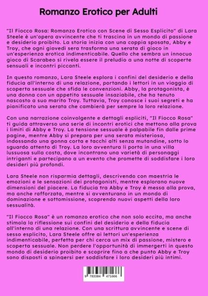 "Il Fiocco Rosa: Romanzo Erotico con Scene di Sesso Esplicito" di Lara Steele è un'opera avvincente che ti trascina in un mondo di passione e desiderio proibito. La storia inizia con una coppia sposata, Abby e Troy, che ogni giovedì sera trasforma una serata di gioco in un'esperienza erotica indimenticabile. Quello che sembra un innocuo gioco di Scarabeo si rivela essere il preludio a una notte di scoperte sensuali e incontri piccanti.In questo romanzo, Lara Steele esplora i confini del desiderio e della fiducia all'interno di una relazione, portando i lettori in un viaggio di scoperta sessuale che sfida le convenzioni. Abby, la protagonista, è una donna con un appetito sessuale insaziabile, che ha tenuto nascosto a suo marito Troy. Tuttavia, Troy conosce i suoi segreti e ha pianificato una serata che cambierà per sempre la loro relazione.Con una narrazione coinvolgente e dettagli espliciti, "Il Fiocco Rosa" ti guida attraverso una serie di incontri erotici che mettono alla provai limiti di Abby e Troy. La tensione sessuale è palpabile fin dalle prime pagine, mentre Abby si prepara per una serata misteriosa, indossando una gonna corta e tacchi alti senza mutandine, sotto lo sguardo attento di Troy. La loro avventura li porta in una villa lussuosa sulla costa, dove incontrano una varietà di personaggi intriganti e partecipano a un evento che promette di soddisfare i loro desideri più profondi.Lara Steele non risparmia dettagli, descrivendo con maestria le emozioni e le sensazioni dei protagonisti, mentre esplorano nuove dimensioni del piacere. La fiducia tra Abby e Troy è messa alla prova, ma anche rafforzata, mentre si avventurano in un mondo di dominazione e sottomissione, scoprendo nuovi aspetti della loro sessualità."Il Fiocco Rosa" è un romanzo erotico che non solo eccita, ma anche stimola la riflessione sui confini del desiderio e della fiducia all'interno di una relazione. Con una scrittura avvincente e scene di sesso esplicito, Lara Steele offre ai lettori un'esperienza indimenticabile, perfetta per chi cerca un mix di passione, mistero e scoperta sessuale. Non perdere l'opportunità di immergerti in questo mondo di desiderio proibito e scoprire fino a che punto Abby e Troy sono disposti a spingersi per soddisfare i loro desideri più intimi.