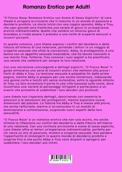 "Il Fiocco Rosa: Romanzo Erotico con Scene di Sesso Esplicito" di Lara Steele è un'opera avvincente che ti trascina in un mondo di passione e desiderio proibito. La storia inizia con una coppia sposata, Abby e Troy, che ogni giovedì sera trasforma una serata di gioco in un'esperienza erotica indimenticabile. Quello che sembra un innocuo gioco di Scarabeo si rivela essere il preludio a una notte di scoperte sensuali e incontri piccanti.In questo romanzo, Lara Steele esplora i confini del desiderio e della fiducia all'interno di una relazione, portando i lettori in un viaggio di scoperta sessuale che sfida le convenzioni. Abby, la protagonista, è una donna con un appetito sessuale insaziabile, che ha tenuto nascosto a suo marito Troy. Tuttavia, Troy conosce i suoi segreti e ha pianificato una serata che cambierà per sempre la loro relazione.Con una narrazione coinvolgente e dettagli espliciti, "Il Fiocco Rosa" ti guida attraverso una serie di incontri erotici che mettono alla provai limiti di Abby e Troy. La tensione sessuale è palpabile fin dalle prime pagine, mentre Abby si prepara per una serata misteriosa, indossando una gonna corta e tacchi alti senza mutandine, sotto lo sguardo attento di Troy. La loro avventura li porta in una villa lussuosa sulla costa, dove incontrano una varietà di personaggi intriganti e partecipano a un evento che promette di soddisfare i loro desideri più profondi.Lara Steele non risparmia dettagli, descrivendo con maestria le emozioni e le sensazioni dei protagonisti, mentre esplorano nuove dimensioni del piacere. La fiducia tra Abby e Troy è messa alla prova, ma anche rafforzata, mentre si avventurano in un mondo di dominazione e sottomissione, scoprendo nuovi aspetti della loro sessualità."Il Fiocco Rosa" è un romanzo erotico che non solo eccita, ma anche stimola la riflessione sui confini del desiderio e della fiducia all'interno di una relazione. Con una scrittura avvincente e scene di sesso esplicito, Lara Steele offre ai lettori un'esperienza indimenticabile, perfetta per chi cerca un mix di passione, mistero e scoperta sessuale. Non perdere l'opportunità di immergerti in questo mondo di desiderio proibito e scoprire fino a che punto Abby e Troy sono disposti a spingersi per soddisfare i loro desideri più intimi.