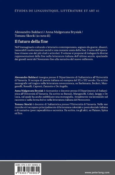 Alessandro Baldacci insegna presso il Dipartimento di Italianistica all¿Università di Varsavia. Si occupa di poesia italiana ed europea del XX e XXI secolo. Ha scritto monografie sul tragico nella letteratura novecentesca, su Bachmann, Beckett, Manganelli, Rosselli, Caproni, Zanzotto e De Angelis. Anna Mägorzata Brysiak è ricercatrice e docente presso il Dipartimento di Italianistica all¿Università di Varsavia. Ha scritto su Buzzati, Manganelli, Celati, Jaeggy e De Luca, sul quale ha anche pubblicato una monografia. Attualmente sta lavorando sul racconto e sulla forma breve nella letteratura italiana del Novecento. Tomasz Skocki è docente di Italianistica presso l¿Università di Varsavia. Nelle sue ricerche si è occupato principalmente di letteratura coloniale e postcoloniale italiana e di narrativa (post-)apocalittica e ucronica. Ha scritto, tra gli altri, su Flaiano, Spina ed Eco.