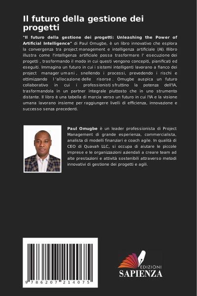 "Il futuro della gestione dei progetti: Unleashing the Power of Artificial Intelligence" di Paul Omugbe, è un libro innovativo che esplora la convergenza tra project management e intelligenza artificiale (AI). Illibro illustra come l'intelligenza artificiale possa trasformare l' esecuzione dei progetti , trasformando il modo in cui questi vengono concepiti, pianificati ed eseguiti. Immagina un futuro in cui i sistemi intelligenti lavorano a fianco dei project manager umani , snellendo i processi, prevedendo i rischi e ottimizzando l 'allocazione delle risorse . Omugbe auspica un futuro collaborativo in cui i professionisti sfruttino la potenza dell'IA, trasformandola in un partner integrale piuttosto che in uno strumento distante. Il libro è una tabella di marcia verso un futuro in cui l'IA e la visione umana lavorano insieme per raggiungere livelli di efficienza, innovazione e successo senza precedenti.