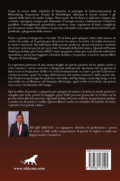 Come la teoria della relatività di Einstein, il principio di indeterminazione di Heisenberg, l'equazione d'onda di Schrödinger affascina le menti curiose e gli amanti della fisica da molto tempo. Man mano che la fisica si addentra sempre più a fondo, emergono sempre più domande. L'energia oscura, l'antimateria, l'universo parallelo, l'entanglement quantistico, eccetera, sono argomenti di fisica complicati per il comune uomo. Ma la fisica e la poesia, entrambe sono espressioni interiori e più profonde, spiegazioni della natura. Fisica e poesia si integrano a vicenda. Né la fisica può spiegare tutto sulla natura, la verità e la realtà, né la poesia può descrivere la natura, la verità e la realtà attraverso le nostre emozioni. Sin dall'inizio della poesia moderna, alcuni scienziati e studenti di scienze scrivono poesie per arricchire il mondo della letteratura. Quando il Premio Nobel per la fisica per l'anno 2022 è stato assegnato a fisici per esperimenti sulla fisica quantistica, mi ha incoraggiato a fondere la fisica e la poesia e a scrivere questo libro "Il gatto di Schrödinger". La repentina partenza di mia amata moglie da questo pianeta mi ha spinto anche a vette emotive e mi ha costretto a rifugiarmi nella poesia. Speriamo che un giorno la fisica troverà l'equazione di Dio e la verità fondamentale su come e perché l'universo è venuto in essere, qual è lo scopo dell'esistenza del nostro universo e delle nostre vite. Che l'universo provenga da qualcosa o da nulla, dal big bang o senza big bang, e se la sua realtà sia un'illusione nel dominio del tempo, ogni verità verrà fuori, ma potrei non essere nel dominio del tempo. Questo libro di poesie è composto per spiegare la natura e la fisica in modo poetico e semplice per tutti, poiché la maggior parte delle persone pensa che né la fisica né la poesia siano alla loro portata. Quando la fisica diventa confusa, la poesia può parlare a modo suo di natura e realtà. Questo libro è anche un tentativo di fusione tra fisica e poesia o tra poesia e fisica.