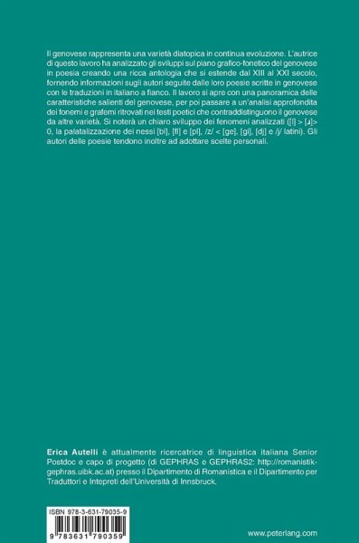 Il genovese rappresenta una varietà diatopica in continua evoluzione. L¿autrice di questo lavoro ha analizzato gli sviluppi sul piano grafico-fonetico del genovese in poesia creando una ricca antologia che si estende dal XIII al XXI secolo, fornendo informazioni sugli autori seguite dalle loro poesie scritte in genovese con le traduzioni in italiano a fianco. Il lavoro si apre con una panoramica delle caratteristiche salienti del genovese, per poi passare a un¿analisi approfondita dei fonemi e grafemi ritrovati nei testi poetici che contraddistinguono il genovese da altre varietà. Si noterà un chiaro sviluppo dei fenomeni analizzati ([l] > [ ] > 0, la palatalizzazione dei nessi [bl], [fl] e [pl], /z/ < [ge], [gi], [dj] e /j/ latini). Gli autori delle poesie tendono inoltre ad adottare scelte personali.