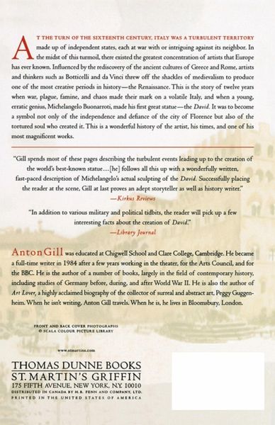 At the turn of the 16th century, Italy was a turbulent territory made up of independent states, each at war with or intriguing against its neighbor. There were the proud, cultivated, and degenerate Sforzas in Milan, and in Rome, the corrupt Spanish family of the Borgia whose head, Rodrigo, ascended to St Peter's throne as Pope Alexander VI. In Florence, a golden age of culture and sophistication ended with the death of the greatest of the Medici family, Lorenzo the Magnificent, giving way to an era of uncertainty, cruelty, and religious fundamentalism. In the midst of this turmoil, there existed the greatest concentration of artists that Europe has ever known. Influenced by the rediscovery of the ancient cultures of Greece and Rome, artists and thinkers such as Botticelli and da Vinci threw off the shackles of the Middle Ages to produce one of the most creative periods in history - the Renaissance. This is the story of twelve years when war, plague, famine, and chaos made their mark on a volatile Italy, and when a young, erratic genius, Michelangelo Buonarroti, made his first great statue - the David. It was to become a symbol not only of the independence and defiance of the city of Florence but also of the tortured soul who created it. This is a wonderful history of the artist, his times, and one of his most magnificent works.