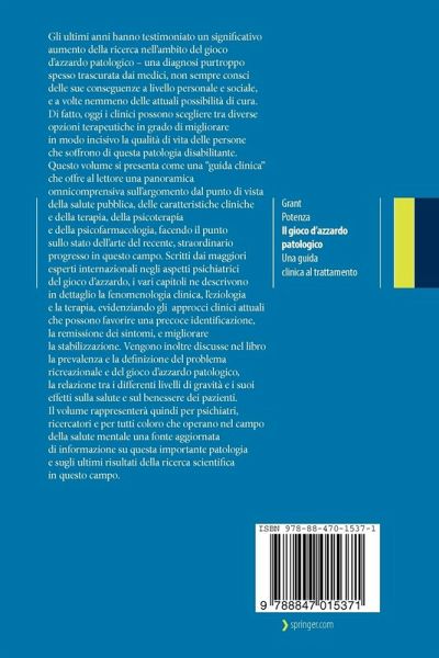 Questo volume si presenta come una "guida clinica" che offre al lettore una panoramica omnicomprensiva sull'argomento dal punto di vista della salute pubblica, delle caratteristiche cliniche e della terapia, della psicoterapia e della psicofarmacologia, facendo il punto sullo stato dell'arte del recente, straordinario progresso in questo campo. Scritti dai maggiori esperti internazionali negli aspetti psichiatrici del gioco d'azzardo, i vari capitoli ne descrivono in dettaglio la fenomenologia clinica, l'eziologia e la terapia, evidenziando gli approcci clinici attuali che possono favorire una precoce identificazione, la remissione dei sintomi, e migliorare la stabilizzazione. Vengono inoltre discusse nel libro la prevalenza e la definizione del problema ricreazionale e del gioco d'azzardo patologico, la relazione tra i differenti livelli di gravità e i suoi effetti sulla salute e sul benessere dei pazienti.