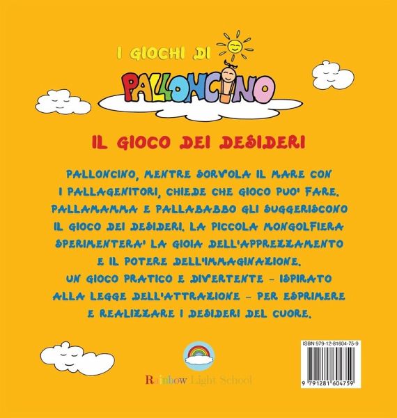 PALLONCINO, MENTRE SORVOLA IL MARE CON I PALLAGENITORI, CHIEDE CHE GIOCO PUO' FARE. PALLAMAMMA E PALLABABBO GLI SUGGERISCONO IL GIOCO DEI DESIDERI. LA PICCOLA MONGOLFIERA SPERIMENTERA' LA GIOIA DELL'APPREZZAMENTO E IL POTERE DELL'IMMAGINAZIONE. ¿UN GIOCO PRATICO E DIVERTENTE - ISPIRATO ALLA LEGGE DELL'ATTRAZIONE - PER ESPRIMERE E REALIZZARE I DESIDERI DEL CUORE.