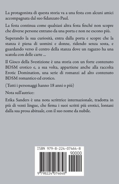 La protagonista di questa storia va a una festa con alcuni amici accompagnata dal suo fidanzato Paul. La festa continua come qualsiasi altra festa finché non scopre che diverse persone entrano da una porta e non ne escono più. Superando la sua curiosità, entra dalla porta e scopre che la stanza è piena di uomini e donne, ridendo senza sosta, e guardando verso il centro della stanza dove un ragazzo ha una scatola con delle carte ... Il Gioco della Svestizione è una storia con un forte contenuto BDSM erotico e, a sua volta, appartiene anche alla raccolta Erotic Domination, una serie di romanzi ad alto contenuto BDSM romantico ed erotico. (Tutti i personaggi hanno 18 anni o più) Nota sull'autrice: Erika Sanders è una nota scrittrice internazionale, tradotta in più di venti lingue, che firma i suoi scritti più erotici, lontani dalla sua prosa abituale, con il suo nome da nubile.
