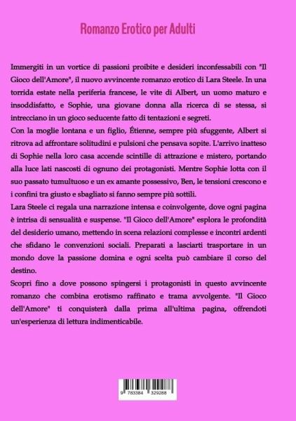 Immergiti in un vortice di passioni proibite e desideri inconfessabili con "Il Gioco dell'Amore", il nuovo avvincente romanzo erotico di Lara Steele. In una torrida estate nella periferia francese, le vite di Albert, un uomo maturo e insoddisfatto, e Sophie, una giovane donna alla ricerca di se stessa, si intrecciano in un gioco seducente fatto di tentazioni e segreti.Con la moglie lontana e un figlio, Étienne, sempre più sfuggente, Albert si ritrova ad affrontare solitudini e pulsioni che pensava sopite. L'arrivo inatteso di Sophie nella loro casa accende scintille di attrazione e mistero, portando alla luce lati nascosti di ognuno dei protagonisti. Mentre Sophie lotta con il suo passato tumultuoso e un ex amante possessivo, Ben, le tensioni crescono e i confini tra giusto e sbagliato si fanno sempre più sottili.Lara Steele ci regala una narrazione intensa e coinvolgente, dove ogni pagina è intrisa di sensualità e suspense. "Il Gioco dell'Amore" esplora le profondità del desiderio umano, mettendo in scena relazioni complesse e incontri ardenti che sfidano le convenzioni sociali. Preparati a lasciarti trasportare in un mondo dove la passione domina e ogni scelta può cambiare il corso del destino.Scopri fino a dove possono spingersi i protagonisti in questo avvincente romanzo che combina erotismo raffinato e trama avvolgente. "Il Gioco dell'Amore" ti conquisterà dalla prima all'ultima pagina, offrendoti un'esperienza di lettura indimenticabile.