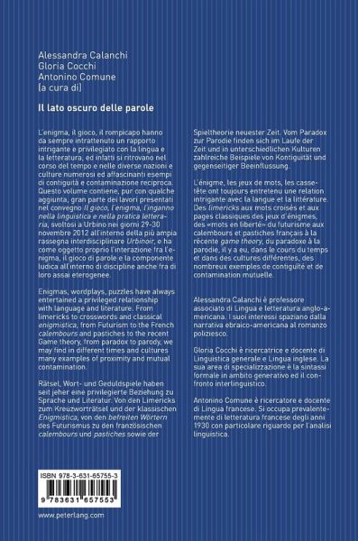 Contenuto: Alessandra Calanchi/Gloria Cocchi/Antonino Comune: Introduzione - Anna Teresa Ossani: Saluto - Piero Toffano: Saluto - Roberta Mullini: Rosalind/Ganymede/Rosalind: travestimento, gioco, enigma in As You Like It di William Shakespeare - Antonino Comune: Enigma come gioco: Le jeu de l'amour et du hasard di Marivaux - Gino Scatasta: Vite fantastiche di Chapman e Keats (e di Brian O'Nolan, di Myles na gCopaleen, di Flann O'Brien e di molti altri) - Matteo Martelli: La cortesia dell'inganno: gioco e menzogna in Nel museo di Reims di Daniele Del Giudice - Mariacristina Natalia Bertoli: Il poeta apprendista stregone: magia nella poesia americana contemporanea - Francesca Cocco: Il lato oscuro delle parole crociate. Consuetudini e originalità del linguaggio cruciverbistico - Gloria Cocchi: Fenomeni linguistici nell'enigmistica classica - Giulia Ovarelli: Creatività e cattiveria: risolvere un romanzo con l'enigmistica - Giuliano Mori: Mondi ed emblemi egizî in Athanasius Kircher. La decifrazione di un particolare della Tabula Bembina - Sabina Crippa: Tracce sonore del linguaggio enigmatico - Gian Italo Bischi: Determinismo, relativismo, complessità: le vite parallele di matematica e romanzo poliziesco - Caterina Marrone: Dubbi, sospetti e fiori in cifra per Agatha Christie - Claus Ehrhardt: Conversazione come sfida intellettuale. Teoria e prassi dell'interrogatorio in alcune opere di Friedrich Ani - Alessandra Calanchi: Il lato oscuro della parola Amore - Silio Bozzi: Ipostasi, ovvero del multiverso semantico.
