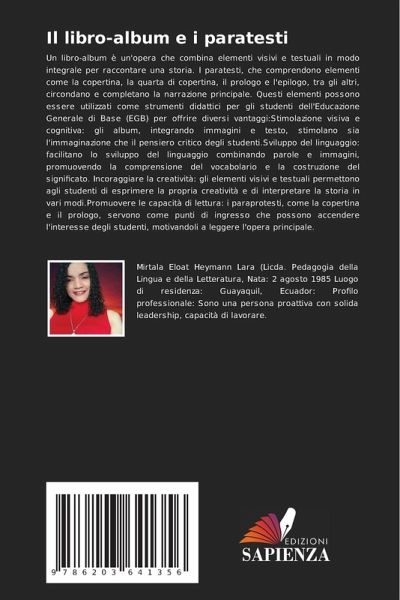 Un libro-album è un'opera che combina elementi visivi e testuali in modo integrale per raccontare una storia. I paratesti, che comprendono elementi come la copertina, la quarta di copertina, il prologo e l'epilogo, tra gli altri, circondano e completano la narrazione principale. Questi elementi possono essere utilizzati come strumenti didattici per gli studenti dell'Educazione Generale di Base (EGB) per offrire diversi vantaggi:Stimolazione visiva e cognitiva: gli album, integrando immagini e testo, stimolano sia l'immaginazione che il pensiero critico degli studenti.Sviluppo del linguaggio: facilitano lo sviluppo del linguaggio combinando parole e immagini, promuovendo la comprensione del vocabolario e la costruzione del significato. Incoraggiare la creatività: gli elementi visivi e testuali permettono agli studenti di esprimere la propria creatività e di interpretare la storia in vari modi.Promuovere le capacità di lettura: i paraprotesti, come la copertina e il prologo, servono come punti di ingresso che possono accendere l'interesse degli studenti, motivandoli a leggere l'opera principale.
