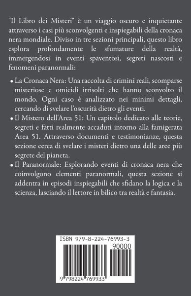 "Il Libro dei Misteri" è un viaggio oscuro e inquietante attraverso i casi più sconvolgenti e inspiegabili della cronaca nera mondiale. Diviso in tre sezioni principali, questo libro esplora profondamente le sfumature della realtà, immergendosi in eventi spaventosi, segreti nascosti e fenomeni paranormali:La Cronaca Nera: Una raccolta di crimini reali, scomparse misteriose e omicidi irrisolti che hanno sconvolto il mondo. Ogni caso è analizzato nei minimi dettagli, cercando di svelare l'oscurità dietro gli eventi. Il Mistero dell'Area 51: Un capitolo dedicato alle teorie, segreti e fatti realmente accaduti intorno alla famigerata Area 51. Attraverso documenti e testimonianze, questa sezione cerca di svelare i misteri dietro una delle aree più segrete del pianeta. Il Paranormale: Esplorando eventi di cronaca nera che coinvolgono elementi paranormali, questa sezione si addentra in episodi inspiegabili che sfidano la logica e la scienza, lasciando il lettore in bilico tra realtà e fantasia.
