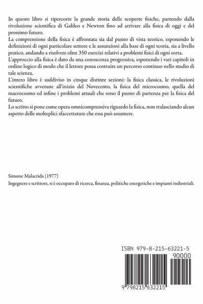 In questo libro si ripercorre la grande storia delle scoperte fisiche, partendo dalla rivoluzione scientifica di Galileo e Newton fino ad arrivare alla fisica di oggi e del prossimo futuro. La comprensione della fisica è affrontata sia dal punto di vista teorico, esponendo le definizioni di ogni particolare settore e le assunzioni alla base di ogni teoria, sia a livello pratico, andando a risolvere oltre 350 esercizi relativi a problemi fisici di ogni sorta. L'approccio alla fisica è dato da una conoscenza progressiva, esponendo i vari capitoli in ordine logico di modo che il lettore possa costruire un percorso continuo nello studio di tale scienza. L'intero libro è suddiviso in cinque distinte sezioni: la fisica classica, le rivoluzioni scientifiche avvenute all'inizio del Novecento, la fisica del microcosmo, quella del macrocosmo ed infine i problemi attuali che sono il punto di partenza per la fisica del futuro. Lo scritto si pone come opera omnicomprensiva riguardo la fisica, non tralasciando alcun aspetto delle molteplici sfaccettature che essa può assumere.