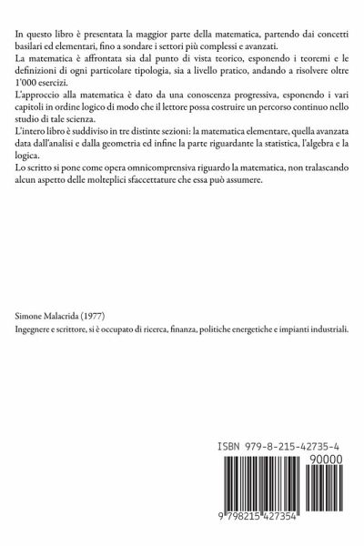 In questo libro è presentata la maggior parte della matematica, partendo dai concetti basilari ed elementari, fino a sondare i settori più complessi e avanzati. La matematica è affrontata sia dal punto di vista teorico, esponendo i teoremi e le definizioni di ogni particolare tipologia, sia a livello pratico, andando a risolvere oltre 1'000 esercizi. L'approccio alla matematica è dato da una conoscenza progressiva, esponendo i vari capitoli in ordine logico di modo che il lettore possa costruire un percorso continuo nello studio di tale scienza. L'intero libro è suddiviso in tre distinte sezioni: la matematica elementare, quella avanzata data dall'analisi e dalla geometria ed infine la parte riguardante la statistica, l'algebra e la logica. Lo scritto si pone come opera omnicomprensiva riguardo la matematica, non tralascando alcun aspetto delle molteplici sfaccettature che essa può assumere.