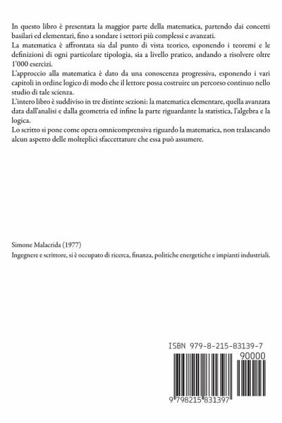 In questo libro è presentata la maggior parte della matematica, partendo dai concetti basilari ed elementari, fino a sondare i settori più complessi e avanzati. La matematica è affrontata sia dal punto di vista teorico, esponendo i teoremi e le definizioni di ogni particolare tipologia, sia a livello pratico, andando a risolvere oltre 1'000 esercizi. L'approccio alla matematica è dato da una conoscenza progressiva, esponendo i vari capitoli in ordine logico di modo che il lettore possa costruire un percorso continuo nello studio di tale scienza. L'intero libro è suddiviso in tre distinte sezioni: la matematica elementare, quella avanzata data dall'analisi e dalla geometria ed infine la parte riguardante la statistica, l'algebra e la logica. Lo scritto si pone come opera omnicomprensiva riguardo la matematica, non tralascando alcun aspetto delle molteplici sfaccettature che essa può assumere.