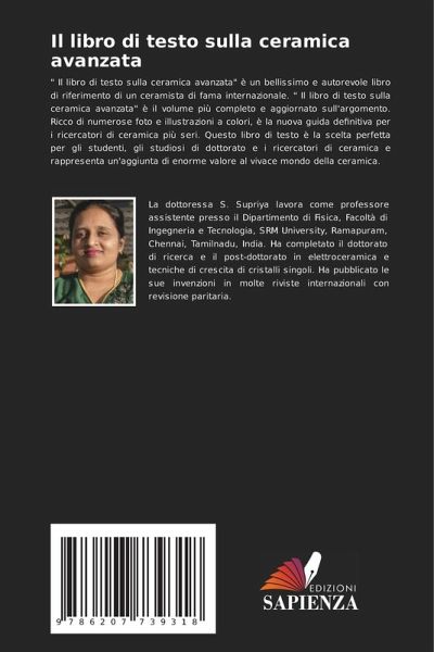 " Il libro di testo sulla ceramica avanzata" è un bellissimo e autorevole libro di riferimento di un ceramista di fama internazionale. " Il libro di testo sulla ceramica avanzata" è il volume più completo e aggiornato sull'argomento. Ricco di numerose foto e illustrazioni a colori, è la nuova guida definitiva per i ricercatori di ceramica più seri. Questo libro di testo è la scelta perfetta per gli studenti, gli studiosi di dottorato e i ricercatori di ceramica e rappresenta un'aggiunta di enorme valore al vivace mondo della ceramica.