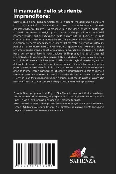 Questo libro è una guida completa per gli studenti che aspirano a conciliare le responsabilità accademiche con l'entusiasmante mondo dell'imprenditoria. Illustra i vantaggi e le sfide delle imprese gestite da studenti, fornendo consigli pratici sullo sviluppo di una mentalità imprenditoriale, sull'identificazione delle opportunità di business e sulla creazione di una startup mentre si è ancora a scuola. Il libro fornisce anche indicazioni su come riconoscere le lacune del mercato, sfruttare gli interessi personali e condurre ricerche di mercato approfondite. Vengono inoltre affrontate considerazioni legali e finanziarie, offrendo agli studenti una solida base per comprendere la registrazione dell'impresa, i diritti di proprietà intellettuale e la gestione finanziaria. Il libro sottolinea l'importanza di creare una storia di marca convincente e di utilizzare strategie di marketing efficaci dal punto di vista dei costi, come i social media e il guerrilla marketing, per promuovere le loro attività. Il libro illustra anche come scalare un'impresa dopo la laurea, come passare da studente a imprenditore a tempo pieno e come cercare investimenti. Il libro è arricchito da casi di studio e storie di successo, che forniscono ispirazione e lezioni pratiche da parte di coloro che hanno affrontato con successo il viaggio dello studente-imprenditore.