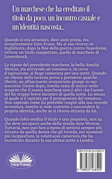 Quando il nuovo marchese di Lowenbrock eredita inaspettatamente il titolo e una proprietà, nessuno lo informa che deve occuparsi anche della timida miss Weston. Tuttavia, non può fare a meno di sentirsi sempre più attratto da quella donna che gli ricorda, nei momenti più inopportuni, la voluttuosa barista che ha incontrato durante la sua ultima notte a Londra. Un recente marchese, un incontro casuale e un'identità nascosta... Quando si era arruolato, dieci anni prima, era semplicemente John Evans. Ma al suo ritorno in Inghilterra, dopo la fine della guerra contro Napoleone, ottiene un titolo inaspettato- Marchese di Lowenbrock. La nipote del precedente marchese, la bella Amelia Weston, sta scrivendo un romanzo e, in cerca d'ispirazione, si finge barista per una notte. Quando un cliente della taverna cerca di prendersi qualche libertà, un affascinante sconosciuto giunge in soccorso della giovane. Giorni dopo, Amelia resta di stucco nello scoprire che il nuovo marchese non è altri che l'uomo del fin troppo breve incontro di quella notte. Lo stesso al quale si è ispirata per il protagonista del romanzo. Non sapendo come lui potrebbe reagire alla sua recente avventura, Amelia si vede costretta a nascondere la propria identità, anche se si ritrova attratta da lui. Quando John eredita il titolo e una proprietà, nessuno lo informa che deve occuparsi anche della timida miss Weston. Tuttavia, non può fare a meno di sentirsi sempre più attratto da quella donna che gli ricorda, nei momenti più inopportuni, la voluttuosa barista che ha incontrato durante la sua ultima notte a Londra.