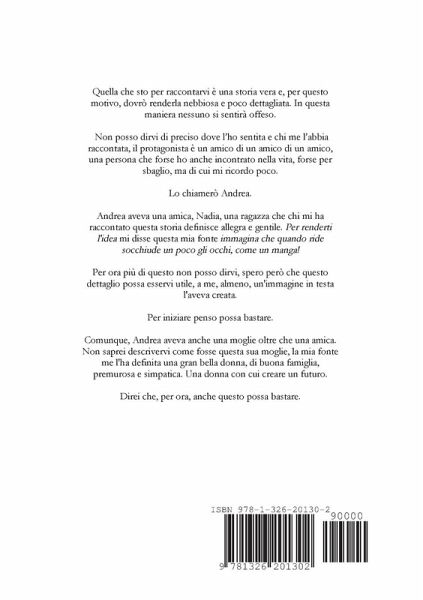 Quella che sto per raccontarvi è una storia vera e, per questo motivo, dovrò renderla nebbiosa e poco dettagliata. In questa maniera nessuno si sentirà offeso. Non posso dirvi di preciso dove l'ho sentita e chi me l'abbia raccontata, il protagonista è un amico di un amico di un amico, una persona che forse ho anche incontrato nella vita, forse per sbaglio, ma di cui mi ricordo poco. Lo chiamerò Andrea. Andrea aveva una amica, Nadia, una ragazza che chi mi ha raccontato questa storia definisce allegra e gentile. Per renderti l'idea mi disse questa mia fonte immagina che quando ride socchiude un poco gli occhi, come un manga! Per ora più di questo non posso dirvi, spero però che questo dettaglio possa esservi utile, a me, almeno, un'immagine in testa l'aveva creata. Per iniziare penso possa bastare. Comunque, Andrea aveva anche una moglie oltre che una amica. Una gran bella donna, di buona famiglia, premurosa e simpatica. Una donna con cui creare un futuro. Direi che, per ora, anche questo possa bastare.