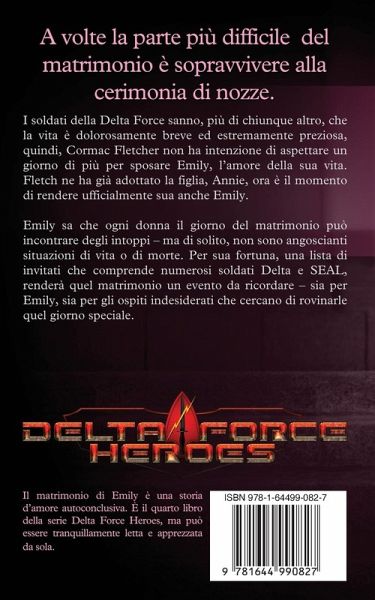 I soldati della Delta Force sanno, più di chiunque altro, che la vita è dolorosamente breve ed estremamente preziosa, quindi, Cormac Fletcher non ha intenzione di aspettare un giorno di più per sposare Emily, l'amore della sua vita. Fletch ne ha già adottato la figlia, Annie, ora è il momento di rendere ufficialmente sua anche Emily.¿¿ Emily sa che ogni donna il giorno del matrimonio può incontrare degli intoppi - ma di solito, non sono angoscianti situazioni di vita o di morte. Per sua fortuna, una lista di invitati che comprende numerosi soldati Delta e SEAL, renderà quel matrimonio un evento da ricordare - sia per Emily, sia per gli ospiti indesiderati che cercano di rovinarle quel giorno speciale.¿¿ ** Il matrimonio di Emily è il quarto libro della serie Delta Force Heroes. Può essere letto come autoconclusivo, ma è consigliabile leggere i libri della serie nell'ordine, per apprezzarli al massimo.