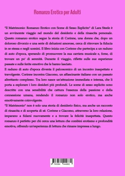 "Il Matrimonio: Romanzo Erotico con Scene di Sesso Esplicito" di Lara Steele è un avvincente viaggio nel mondo del desiderio e della rinascita personale. Questo romanzo erotico segue la storia di Corinne, una donna che, dopo un doloroso divorzio e una serie di delusioni amorose, cerca di ritrovare la fiducia in se stessa e negli uomini. Il libro inizia con Corinne che partecipa a un raduno di auto d'epoca, sperando di promuovere la sua carriera musicale e, forse, di trovare un po' di serenità. Durante il viaggio, riflette sulle sue esperienze passate e sulle ferite emotive che le hanno lasciato.Il raduno di auto d'epoca diventa il palcoscenico di un incontro inaspettato e travolgente. Corinne incontra Giacomo, un affascinante italiano con un passato altrettanto complesso. Tra loro nasce un'attrazione immediata e intensa, che li porta a esplorare i loro desideri più profondi. Le scene di sesso esplicito sono descritte con una sensibilità che cattura l'essenza della passione e della connessione umana, rendendo il romanzo non solo erotico, ma anche emotivamente coinvolgente."Il Matrimonio" non è solo una storia di desiderio fisico, ma anche un racconto di rinascita e di scoperta di sé. Corinne e Giacomo, attraverso la loro relazione, imparano a fidarsi nuovamente e a trovare la felicità inaspettata. Questo romanzo è perfetto per chi cerca una lettura che combini erotismo e profondità emotiva, offrendo un'esperienza di lettura che rimane impressa a lungo.