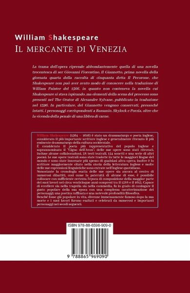 La trama dell'opera riprende abbondantemente quella di una novella trecentesca di ser Giovanni Fiorentino, Il Giannetto, prima novella della giornata quarta della raccolta di cinquanta detta Il Pecorone, che Shakespeare non può aver avuto modo di conoscere nella traduzione di William Painter del 1566, in quanto non conteneva la novella cui Shakespeare si stava ispirando, ma elementi della scena del processo sono presenti nel The Orator di Alexandre Sylvane, pubblicato in traduzione nel 1596. In particolare, del Giannetto vengono conservati, pressoché intatti, i personaggi corrispondenti a Bassanio, Shylock e Porzia, oltre che la vicenda della penale di una libbra di carne.