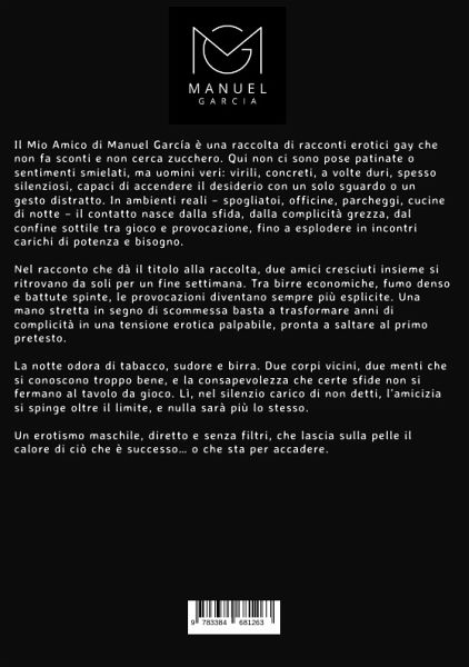 Il Mio Amico di Manuel García è una raccolta di racconti erotici gay che non fa sconti e non cerca zucchero. Qui non ci sono pose patinate o sentimenti smielati, ma uomini veri: virili, concreti, a volte duri, spesso silenziosi, capaci di accendere il desiderio con un solo sguardo o un gesto distratto. In ambienti reali - spogliatoi, officine, parcheggi, cucine di notte - il contatto nasce dalla sfida, dalla complicità grezza, dal confine sottile tra gioco e provocazione, fino a esplodere in incontri carichi di potenza e bisogno.Nel racconto che dà il titolo alla raccolta, due amici cresciuti insieme si ritrovano da soli per un fine settimana. Tra birre economiche, fumo denso e battute spinte, le provocazioni diventano sempre più esplicite. Una mano stretta in segno di scommessa basta a trasformare anni di complicità in una tensione erotica palpabile, pronta a saltare al primo pretesto.La notte odora di tabacco, sudore e birra. Due corpi vicini, due menti che si conoscono troppo bene, e la consapevolezza che certe sfide non si fermano al tavolo da gioco. Lì, nel silenzio carico di non detti, l'amicizia si spinge oltre il limite, e nulla sarà più lo stesso.Un erotismo maschile, diretto e senza filtri, che lascia sulla pelle il calore di ciò che è successo... o che sta per accadere.
