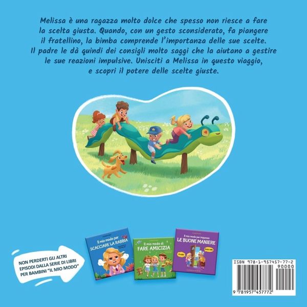 Se vuoi insegnare ai tuoi bimbi a fare le scelte giuste, questo è il libro da leggere assolutamente! In questo libro illustrato sul comportamento sociale troverai le risposte che cerchi: uno tra i libri per bambini più coinvolgenti che può aiutarti a cambiare l'atteggiamento del tuo bambino, spiegandogli che ogni decisione ha le sue conseguenze. Ogni genitore a un certo punto si trova davanti alla sfida di insegnare al proprio bambino a gestire le emozioni e il comportamento; spesso per loro non è facile fare le scelte giuste, e ciò li mette emotivamente in subbuglio. Per i bambini è fondamentale essere in grado di riconoscere le emozioni e i sentimenti e sapere come affrontarli. La storia della piccola Melissa affronta l'importanza di riflettere sulle proprie scelte prima di farle, comprendendone l'impatto e assumendosene la responsabilità. Questo adorabile libro delle emozioni sulla piccola Melissa:tiene incollati i giovani lettori mentre trasmette lezioni fondamentali sulla gentilezza, l'attitudine positiva e l'impatto del proprio comportamento negativo sugli altri; affronta grandi questioni come l'importanza dell'onestà, le conseguenze delle proprie azioni e l'importanza di fare scelte giuste; incoraggia l'empatia, la gentilezza e la compassione tra i giovani lettori; propone bellissime illustrazioni e una simpatica storia in rima; è adatto a bambini sia in età prescolare (3-5 anni) sia più grandicelli (6-10 anni). Anche se le hai già provate tutte per instillare in tuo figlio questi valori, vedrai che questo libro delle emozioni porterà un approccio fresco ed efficace per sviluppare le sue abilità sociali. Cosa aspetti allora: aiuta il tuo bambino ad assumere un comportamento appropriato e un approccio positivo. Compra oggi la tua copia e osserva l'impatto benefico di "Il mio modo per fare le scelte giuste" sulla sua vita!