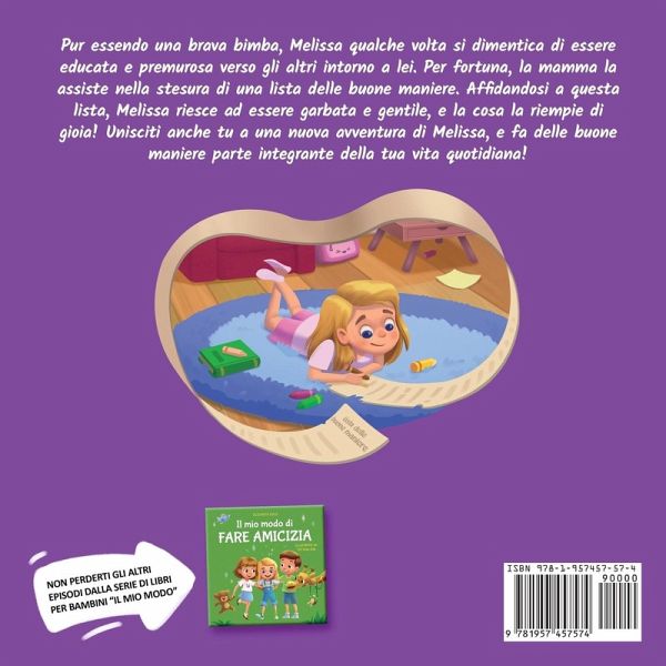 Trovare libri per bambini sulle buone maniere non è sempre un'impresa facile: questo simpatico racconto è un'ottima scelta per genitori di bambini sia in età prescolare (3-5 anni) sia più grandi (6-10 anni). La storia di Melissa può essere d'esempio per ogni bambino. Questo libro illustrato per bambini racconta le avventure di Melissa, una ragazzina sveglia con la quale all'inizio nessuno vuole giocare perché spesso sembra scordarsi le buone maniere. Nel corso della storia, Melissa imparerà a essere più educata. Il libro offre molti spunti per l'insegnamento ai bambini di:abilità sociali norme sociali gentilezza empatia Per affrontare il tema del rispetto, il libro ricorre a una storia sociale che piace e parla tanto ai bambini quanto alle bambine di ogni età, sollevando un problema relativo alle buone maniere e presentandone subito una soluzione. È anche un ottimo strumento per un primo approccio alla lettura: le rime baciate incoraggiano il bambino a leggere insieme ai genitori. Questo lo rende un libro perfetto per la biblioteca di ogni lettore alle prime armi. I libri delle emozioni si propongono inoltre di spiegare il galateo ai bambini attraverso bellissime illustrazioni. Imparare il rispetto e le buone maniere sarà più facile grazie a un racconto in cui i bambini possono identificarsi. Riflettendo su come ci si comporta a tavola o sulle frasi da dire nelle varie situazioni sociali, questo libro sottolinea l'importanza fondamentale dell'educazione e della gentilezza. Aggiungi subito questo libro alla biblioteca di tuo figlio!