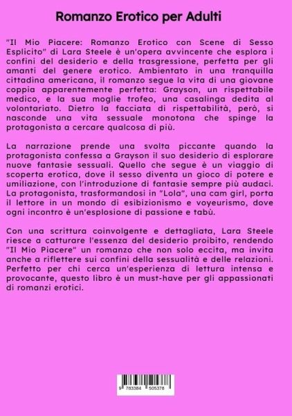 "Il Mio Piacere: Romanzo Erotico con Scene di Sesso Esplicito" di Lara Steele è un'opera avvincente che esplora i confini del desiderio e della trasgressione, perfetta per gli amanti del genere erotico. Ambientato in una tranquilla cittadina americana, il romanzo segue la vita di una giovane coppia apparentemente perfetta: Grayson, un rispettabile medico, e la sua moglie trofeo, una casalinga dedita al volontariato. Dietro la facciata di rispettabilità, però, si nasconde una vita sessuale monotona che spinge la protagonista a cercare qualcosa di più.La narrazione prende una svolta piccante quando la protagonista confessa a Grayson il suo desiderio di esplorare nuove fantasie sessuali. Quello che segue è un viaggio di scoperta erotica, dove il sesso diventa un gioco di potere e umiliazione, con l'introduzione di fantasie sempre più audaci. La protagonista, trasformandosi in "Lola", una cam girl, porta il lettore in un mondo di esibizionismo e voyeurismo, dove ogni incontro è un'esplosione di passione e tabù.Con una scrittura coinvolgente e dettagliata, Lara Steele riesce a catturare l'essenza del desiderio proibito, rendendo "Il Mio Piacere" un romanzo che non solo eccita, ma invita anche a riflettere sui confini della sessualità e delle relazioni. Perfetto per chi cerca un'esperienza di lettura intensa e provocante, questo libro è un must-have per gli appassionati di romanzi erotici.