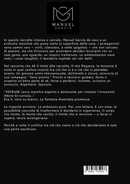 In questa raccolta intensa e carnale, Manuel García dà voce a un erotismo maschile che pulsa sotto la superficie delle cose. I protagonisti sono uomini veri - virili, silenziosi, a volte spigolosi - che non cercano di piacere, ma che finiscono per accendere desideri brucianti con un solo gesto, uno sguardo, un respiro trattenuto. Le ambientazioni sono reali, i corpi tangibili, il desiderio esplode nei non detti.Nel racconto che dà il titolo alla raccolta, Il mio Ragazzo, la tensione è tutta in quel confine incerto tra ciò che si è e ciò che si potrebbe essere. Un giovane uomo eterosessuale, dichiarato e sicuro, annuncia al suo compagno: "Sono pronto." Pronto a lasciarsi guidare, forse a scoprire un'altra parte di sé, forse a perdersi. Insieme, scrivono un annuncio. Aspettano. Sperano."VOYEUSE cerca maschio esperto e dominante per iniziare l'innocente Adone bi-curioso..."Era lì, nero su bianco. La fantasia diventata promessa.Le risposte arrivano. Le esitazioni pure. Poi, una lettera. E con essa, la possibilità concreta di trasformare il desiderio in esperienza. Il corpo che trema, la mente che vacilla, il limite che si avvicina - o forse si supera, senza accorgersene.Perché a volte il confine tra ciò che siamo e ciò che desideriamo è solo una porta socchiusa.