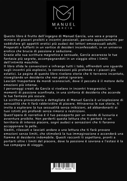Questo libro nasce da un'idea di Manuel García, una vera e propria miniera di piaceri proibiti e incontri passionali, pensata appositamente per soddisfare gli appetiti erotici più audaci dei lettori adulti omosessuali.Preparatevi a tuffarvi in un vortice di desideri inconfessabili, in un universo erotico che brucia di passione e seduzione. Grazie alla sua scrittura magnetica e sensuale, García accarezza le vostre fantasie più segrete, accompagnandovi in un viaggio oltre i limiti dell'intimità maschile.Il libro sfida le convenzioni e infrange tutti i tabù, offrendo uno sguardo agli incontri più esplosivi, ai legami più profondi e ai piaceri più estatici. Le pagine di questo libro rivelano storie che vi terranno incantati, risvegliando un desiderio che non potrete ignorare.Lasciatevi trasportare da mondi sconosciuti, dove il peccato è il motore delle emozioni più intense. I personaggi creati da García si rivelano in incontri trasgressivi, in momenti di passione sconfinata, in una sinfonia di desiderio che accende le vostre fantasie più oscure.La scrittura provocatoria e dettagliata di Manuel García è un'esplosione di sensualità che vi farà rabbrividire di piacere. Attraverso le sue storie, vi invita a esplorare la vostra sessualità senza inibizioni, ad abbandonarvi ai vostri istinti più profondi senza rimorsi o restrizioni.Quest'opera di narrativa è il vostro passaporto per un mondo di lussuria e avventure proibite. Non perdetevi questa lettura che vi porterà in un territorio di piacere intenso, sogni audaci e sensazioni che vi faranno accapponare la pelle.Sedetevi, rilassatevi e lasciatevi andare a una lettura che vi farà provare emozioni senza limiti, che stimolerà la vostra immaginazione e accenderà una fiamma di desiderio indomabile. Questi racconti vi aspettano, pronti a portarvi oltre i limiti del piacere, dove la passione è sovrana e l'estasi è la vostra compagna di viaggio.