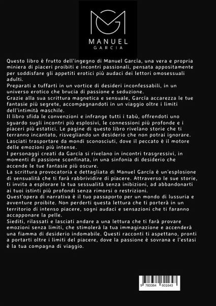 Questo libro nasce da un'idea di Manuel García, una vera e propria miniera di piaceri proibiti e incontri passionali, pensata appositamente per soddisfare gli appetiti erotici più audaci dei lettori adulti omosessuali.Preparatevi a tuffarvi in un vortice di desideri inconfessabili, in un universo erotico che brucia di passione e seduzione. Grazie alla sua scrittura magnetica e sensuale, García accarezza le vostre fantasie più segrete, accompagnandovi in un viaggio oltre i limiti dell'intimità maschile.Il libro sfida le convenzioni e infrange tutti i tabù, offrendo uno sguardo agli incontri più esplosivi, ai legami più profondi e ai piaceri più estatici. Le pagine di questo libro rivelano storie che vi terranno incantati, risvegliando un desiderio che non potrete ignorare.Lasciatevi trasportare da mondi sconosciuti, dove il peccato è il motore delle emozioni più intense. I personaggi creati da García si rivelano in incontri trasgressivi, in momenti di passione sconfinata, in una sinfonia di desiderio che accende le vostre fantasie più oscure.La scrittura provocatoria e dettagliata di Manuel García è un'esplosione di sensualità che vi farà rabbrividire di piacere. Attraverso le sue storie, vi invita a esplorare la vostra sessualità senza inibizioni, ad abbandonarvi ai vostri istinti più profondi senza rimorsi o restrizioni.Quest'opera di narrativa è il vostro passaporto per un mondo di lussuria e avventure proibite. Non perdetevi questa lettura che vi porterà in un territorio di piacere intenso, sogni audaci e sensazioni che vi faranno accapponare la pelle.Sedetevi, rilassatevi e lasciatevi andare a una lettura che vi farà provare emozioni senza limiti, che stimolerà la vostra immaginazione e accenderà una fiamma di desiderio indomabile. Questi racconti vi aspettano, pronti a portarvi oltre i limiti del piacere, dove la passione è sovrana e l'estasi è la vostra compagna di viaggio.