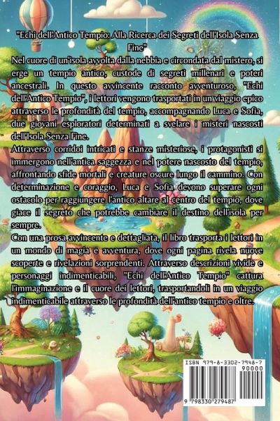 "Echi dell'Antico Tempio: Alla Ricerca dei Segreti dell'Isola Senza Fine" Nel cuore di un'isola avvolta dalla nebbia e circondata dal mistero, si erge un tempio antico, custode di segreti millenari e poteri ancestrali. In questo avvincente racconto avventuroso, "Echi dell'Antico Tempio", i lettori vengono trasportati in un viaggio epico attraverso le profondità del tempio, accompagnando Luca e Sofia, due giovani esploratori determinati a svelare i misteri nascosti dell'Isola Senza Fine. Attraverso corridoi intricati e stanze misteriose, i protagonisti si immergono nell'antica saggezza e nel potere nascosto del tempio, affrontando sfide mortali e creature oscure lungo il cammino. Con determinazione e coraggio, Luca e Sofia devono superare ogni ostacolo per raggiungere l'antico altare al centro del tempio, dove giace il segreto che potrebbe cambiare il destino dell'isola per sempre. Con una prosa avvincente e dettagliata, il libro trasporta i lettori in un mondo di magia e avventura, dove ogni pagina rivela nuove scoperte e rivelazioni sorprendenti. Attraverso descrizioni vivide e personaggi indimenticabili, "Echi dell'Antico Tempio" cattura l'immaginazione e il cuore dei lettori, trasportandoli in un viaggio indimenticabile attraverso le profondità dell'antico tempio e oltre.