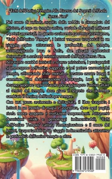 "Echi dell'Antico Tempio: Alla Ricerca dei Segreti dell'Isola Senza Fine" Nel cuore di un'isola avvolta dalla nebbia e circondata dal mistero, si erge un tempio antico, custode di segreti millenari e poteri ancestrali. In questo avvincente racconto avventuroso, "Echi dell'Antico Tempio", i lettori vengono trasportati in un viaggio epico attraverso le profondità del tempio, accompagnando Luca e Sofia, due giovani esploratori determinati a svelare i misteri nascosti dell'Isola Senza Fine. Attraverso corridoi intricati e stanze misteriose, i protagonisti si immergono nell'antica saggezza e nel potere nascosto del tempio, affrontando sfide mortali e creature oscure lungo il cammino. Con determinazione e coraggio, Luca e Sofia devono superare ogni ostacolo per raggiungere l'antico altare al centro del tempio, dove giace il segreto che potrebbe cambiare il destino dell'isola per sempre. Con una prosa avvincente e dettagliata, il libro trasporta i lettori in un mondo di magia e avventura, dove ogni pagina rivela nuove scoperte e rivelazioni sorprendenti. Attraverso descrizioni vivide e personaggi indimenticabili, "Echi dell'Antico Tempio" cattura l'immaginazione e il cuore dei lettori, trasportandoli in un viaggio indimenticabile attraverso le profondità dell'antico tempio e oltre.
