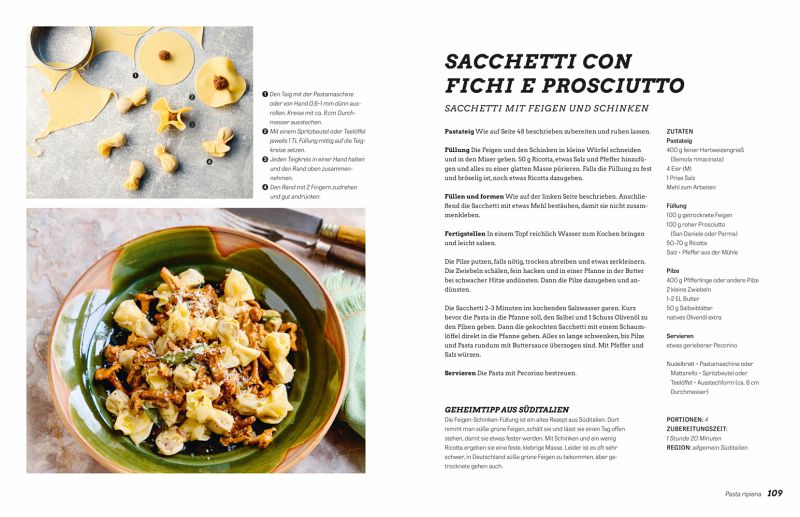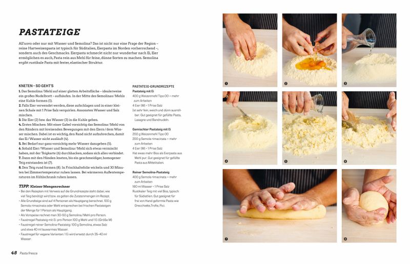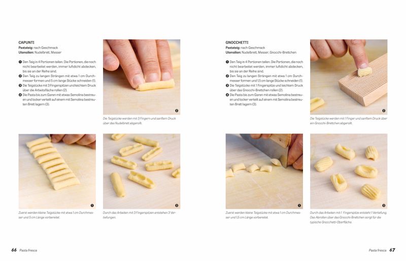 Domenico Gentiles Leidenschaft für die italienische Küche ist in „Il mondo della Pasta“ deutlich zu spüren. Auf den ersten Seiten trägt der Autor Wissenswertes über Pasta zusammen. Er erklärt unter anderem die Geschichte der Nudeln, gibt einen Überblick über die zahlreichen Sorten und beschreibt regionale Unterschiede. Sehr informativ! Anschließend zeigt er, wie Pasta fresca, also frische Nudeln, und Pasta ripiena, gefüllte Nudeln, hergestellt werden. Hier teilt er drei Grundrezepte sowie vier Varianten für farbigen Teig. Ich nehme an, dass es sich dabei um die traditionelle italienische Zubereitungsweise handelt, hätte mir aber ergänzend eine Alternative aus glutenfreiem Mehl gewünscht. Auf den folgenden Seiten sieht man dann, wie Tagliatelle, Farfalle, Orecchiette und viele weitere Pastasorten geformt werden. Die Arbeitsschritte sind dabei knapp erklärt und überwiegend gut bebildert, sodass das Nacharbeiten leicht gelingt.